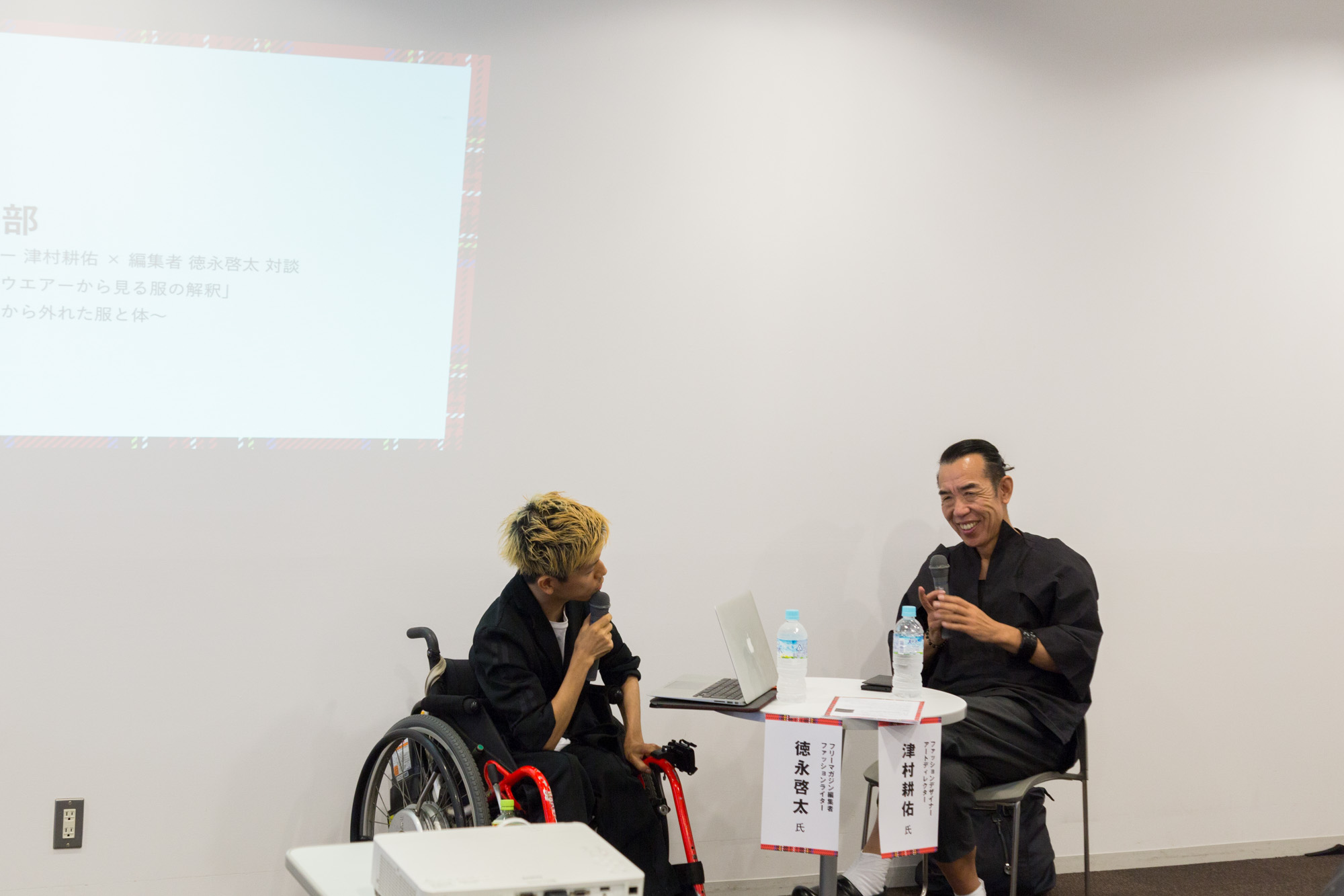 このイベントは編集者・ファッションライターの徳永啓太氏が発行するフリーマガジン第一弾リリースをきっかけに開催しました。このフリーマガジンには、「未来のファッションとは」というテーマのもとで、先天性脳性麻痺で車椅子で活動する徳永啓太さんが関心を持った「パズルウエアー」をデザインされたファッションデザイナー津村耕佑さんの2人の価値観を掛け合わせた対談の内容が掲載されています。また一方的に徳永さんの考え方を伝えるのではなく対話していきたいということが書かれていました。