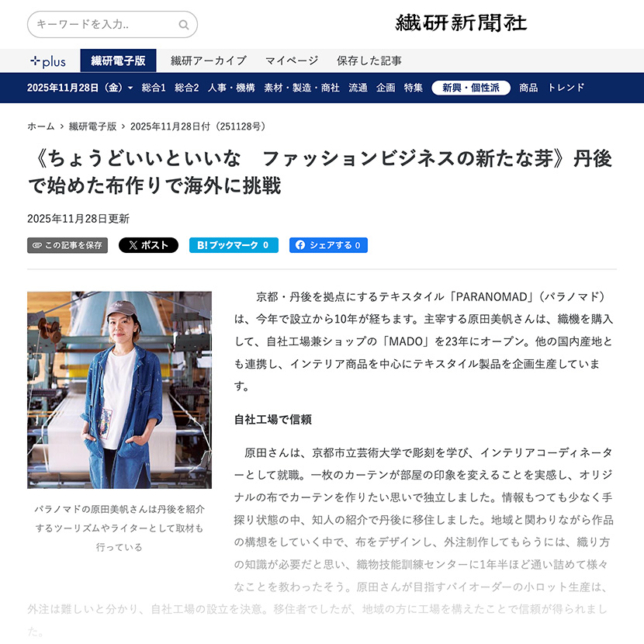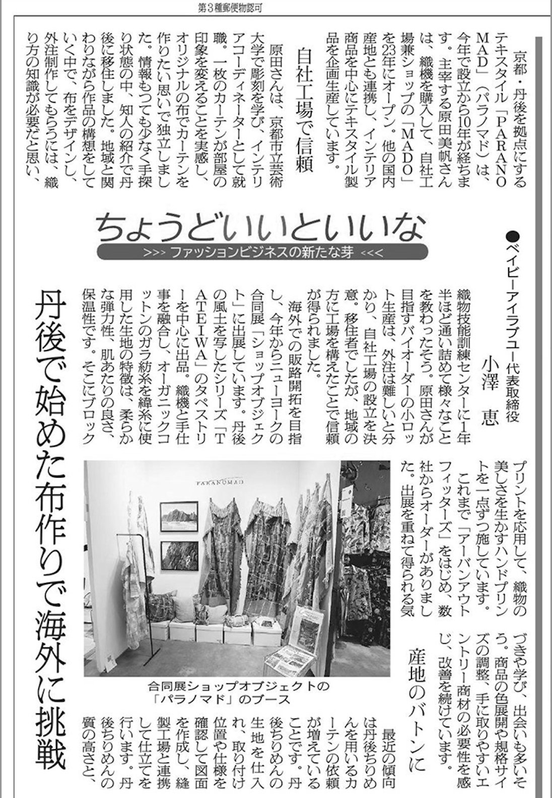 ファッションビジネス専門紙、繊研新聞「新興・個性派」コーナーに掲載。